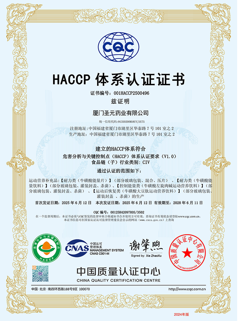 Xiamen Shengyuan Pharmaceutical Co., Ltd. is built in strict accordance with Chinese GMP and American cGMP standards, and meets the registration requirements of the Chinese Pharmacopoeia and the United States Pharmacopoeia, as well as the relevant guidelines for active pharmaceutical ingredients and food additives. It has GMP, DMF, and FDA qualifications for active pharmaceutical ingredients and food additives, and has established a complete production quality management system that meets GMP standards. It has passed ISO9001, ISO22000, HACCP, FSSC22000 and other system certifications, and all products are jointly insured by PICC. Ensure the safe and reliable sale of company products to domestic and international markets.
