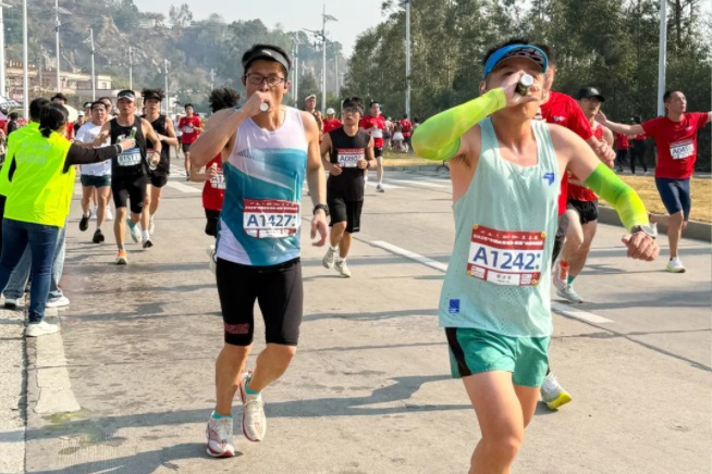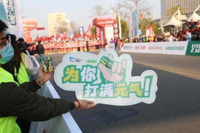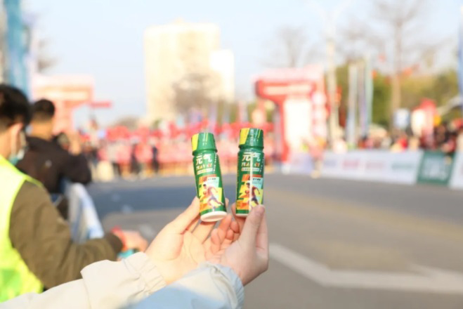 “加油,加油!”元气小树能量补给站边,来自圣元的加油团毫不吝啬赞美、鼓励,为来自各地的跑友送上最热情的助力,并为参赛者分发补给品——60mL便携装元气小树牛磺酸能量饮,富含牛磺酸、维生素B族等成分,护航参赛者保持良好状态、圆满完赛。